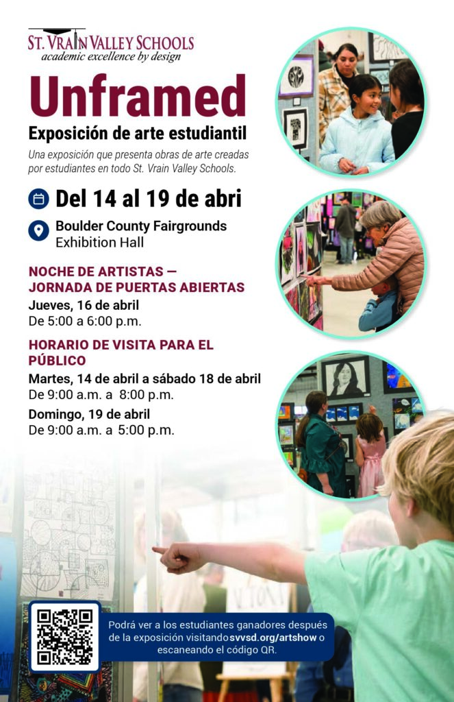 Poster for "Unframed Student Art Show" at Boulder County Fairgrounds, showcasing student artwork from St. Vrain Valley Schools.