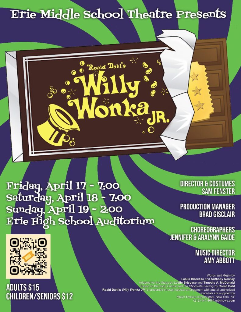 Come join us for a magical evening at Erie Middle School’s Willy Wonka performance! Step into a world of pure imagination and enjoy a fun-filled show brought to life by our talented students. Please click this link or scan the QR code to purchase tickets.