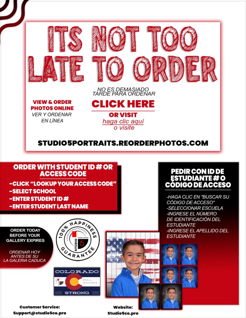 2nd Round Ordering InfoMissed the first deadline? No worries! Orders from this round will arrive separately, a bit later than the first batch. Good News!Our special prepay pricing has been extended through Tuesday, September 23rd — don’t miss out! Place your order now to avoid any extra fees! Direct Ordering Link:http://www.studio5portraits.preorderphotos.com/?AccessCode=P34WE7Access Code: P34WE7