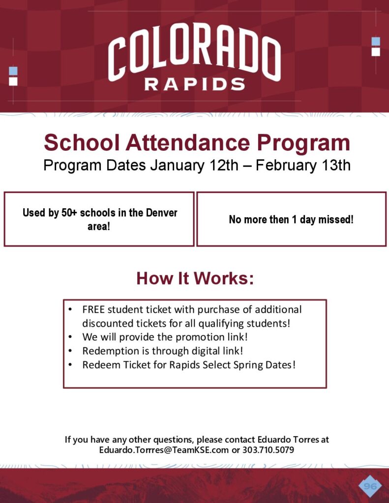 Hemos establecido una colaboración con los Colorado Rapids para recompensar e incentivar la asistencia aquí en la escuela Erie, brindando a los estudiantes que tengan no mas de 1 dia perdido, desde el 12 de Enero hasta el 13 de Febrero, un boleto de cortesía para un partido de los Colorado Rapids.