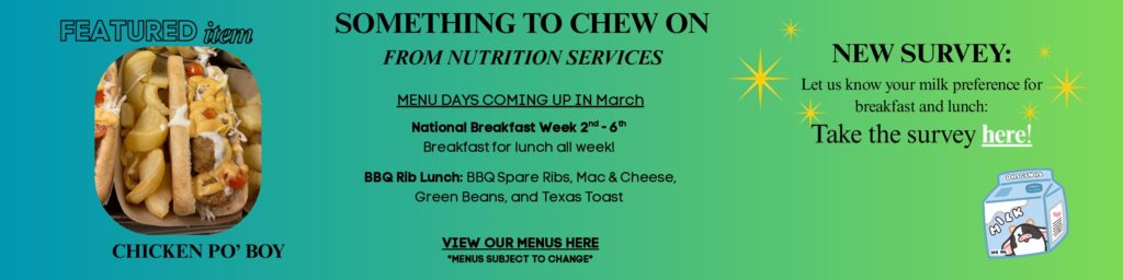 We want to hear from you! What milk varieties would you like to see offered to your student during the school day? Please click here to fill out the Nutrition Services Survey. Responses will be considered in addition to price for the 2026-2027 school year.